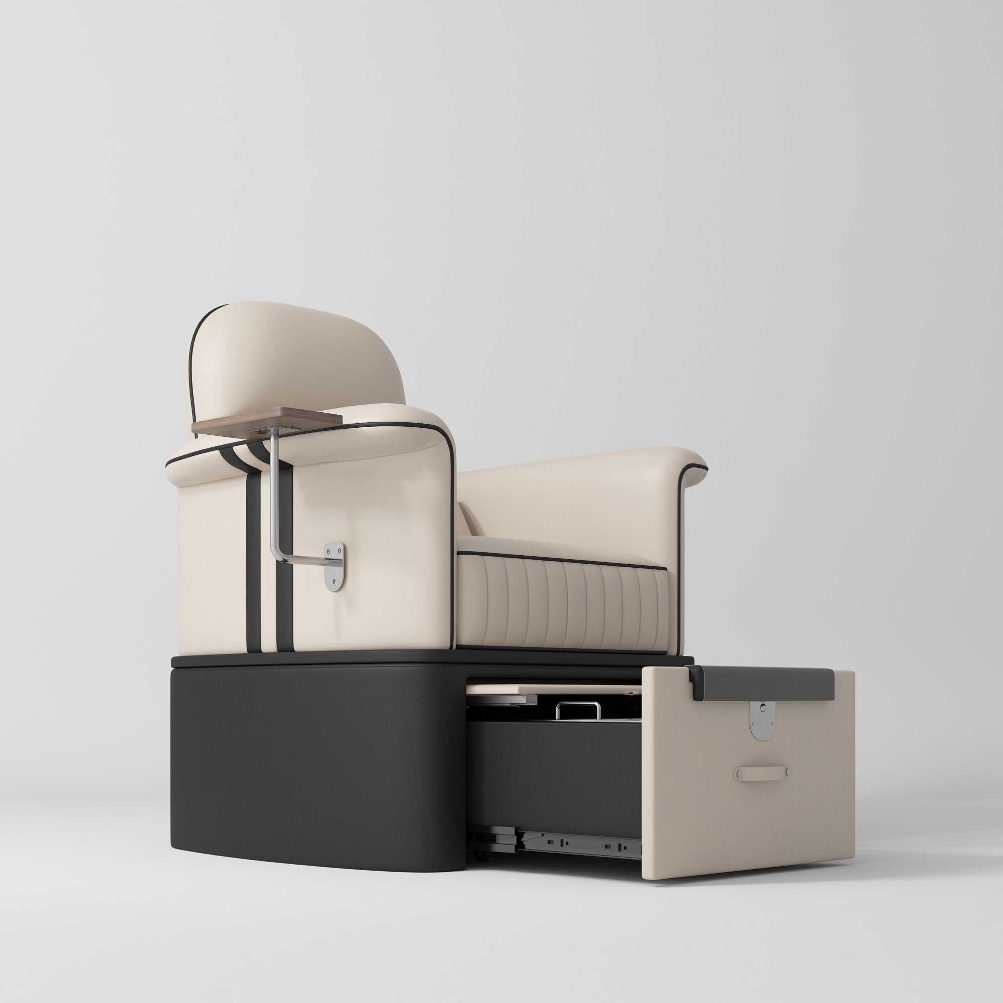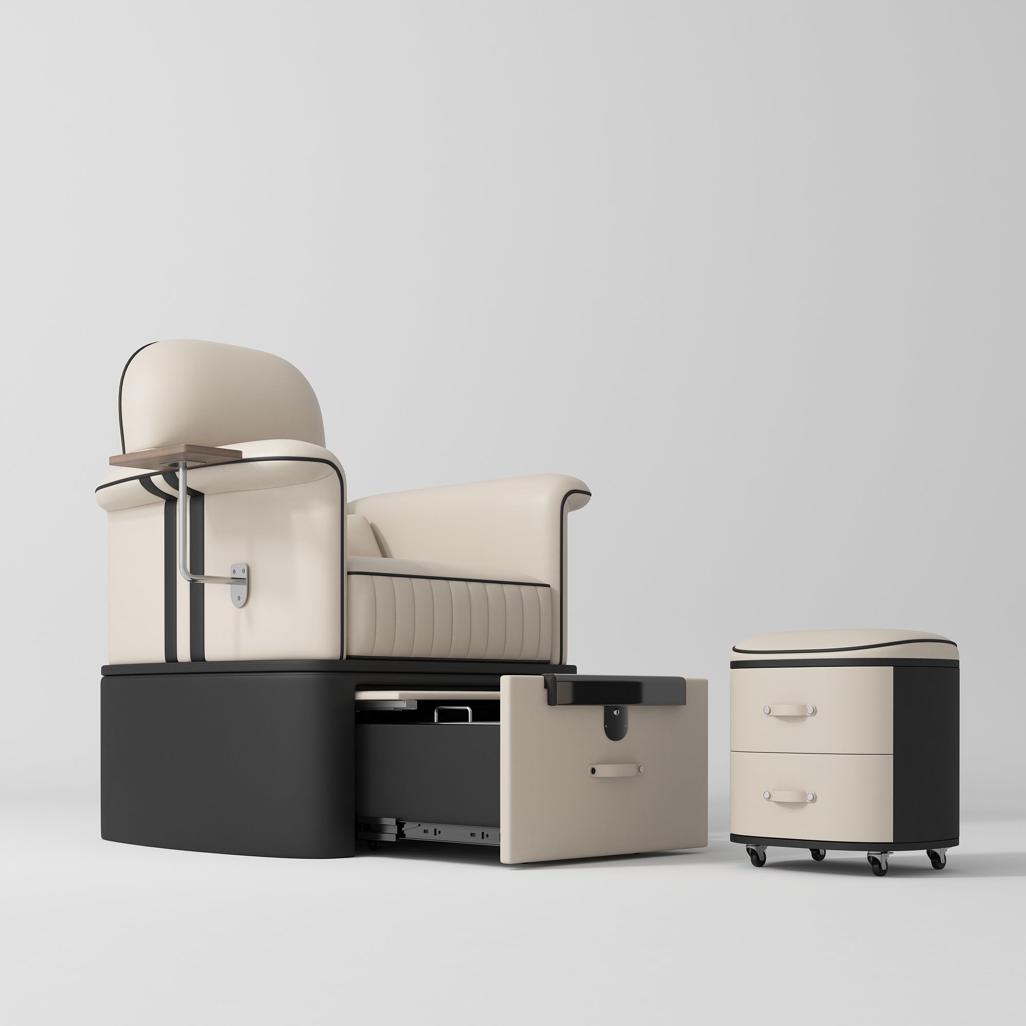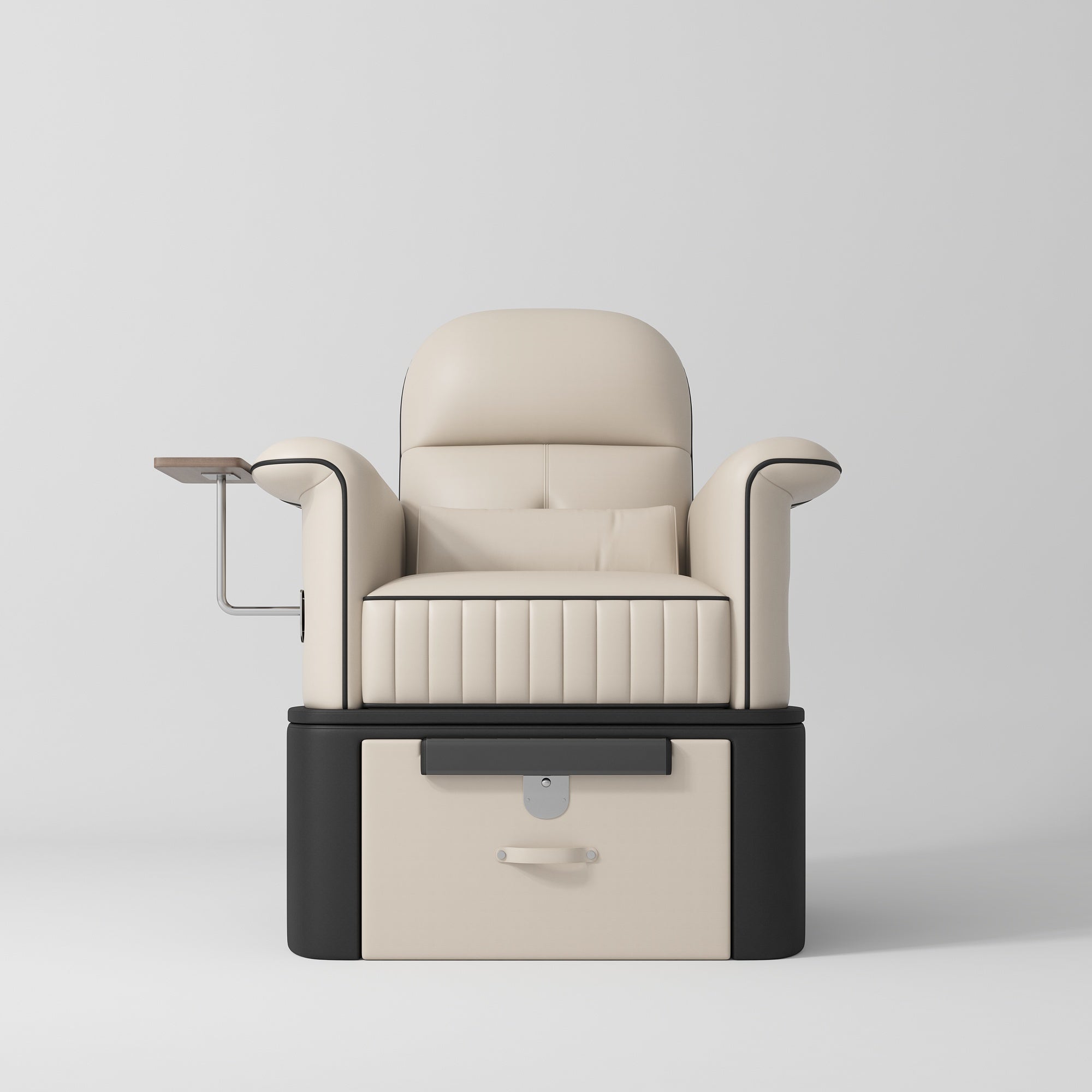 This all-in-one pedicure chair features an integrated foot spa with a hidden footrest, an easy-roll drawer for tidy storage, plus a pull-out foot platform and built-in manicure table for added versatility. Smart, space-saving, and professional, it’s a reliable investment for any busy salon.